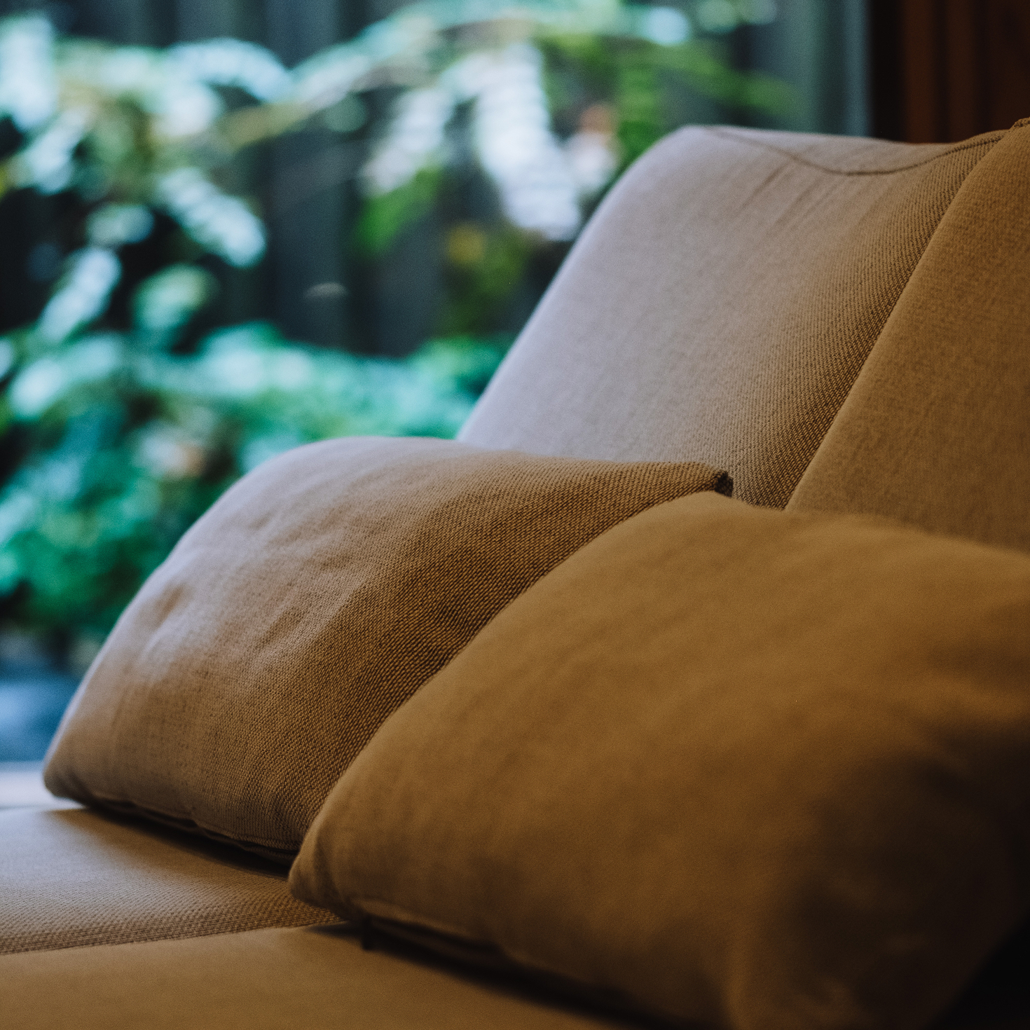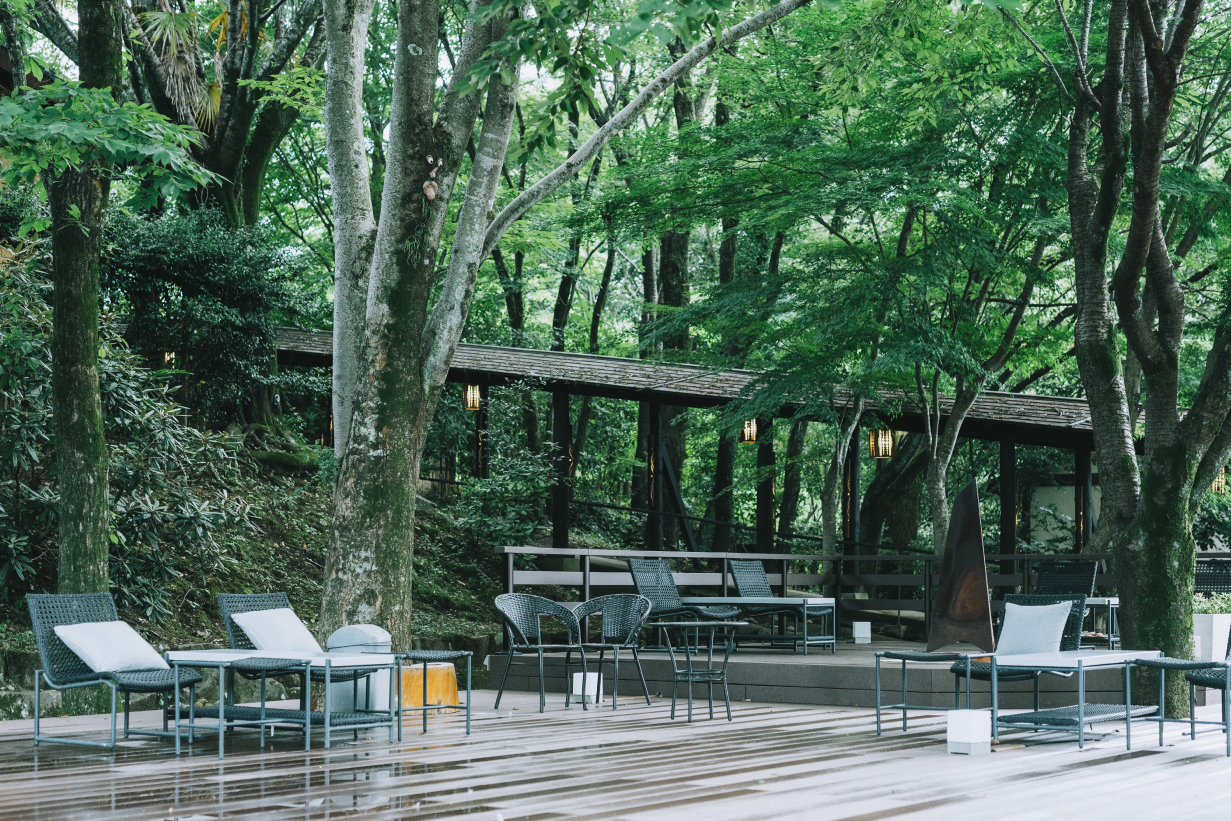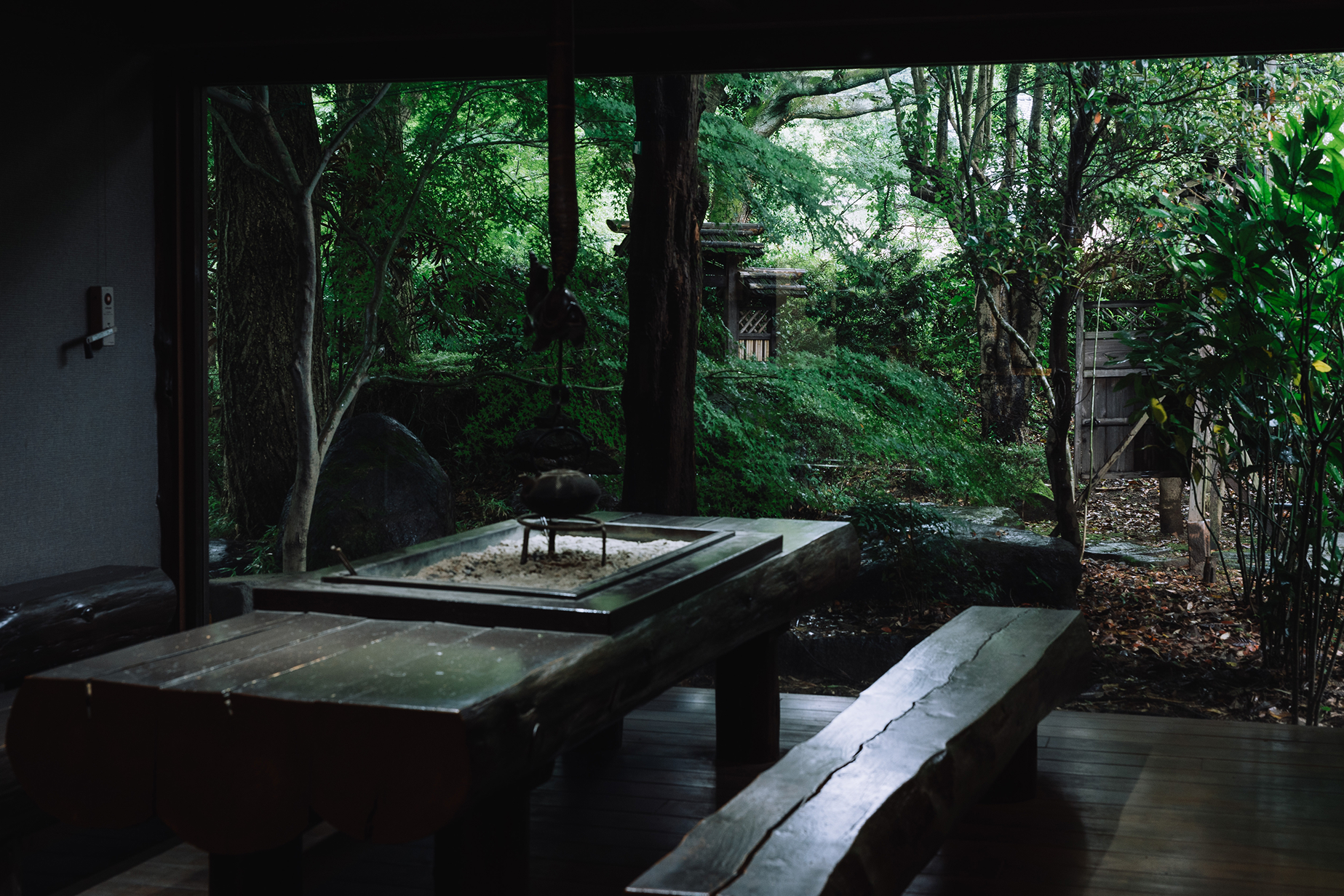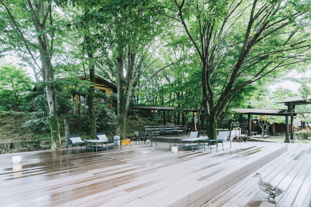 ロビーや大浴場、お食事処につながる渡り廊下の途中にある中庭。簡易的な休憩所にもなっており、食事の後の休憩や湯冷しなど、一息つける休憩所です。