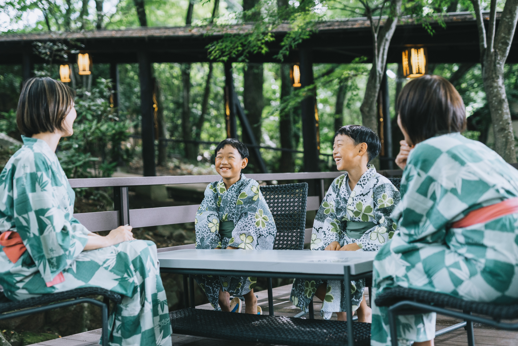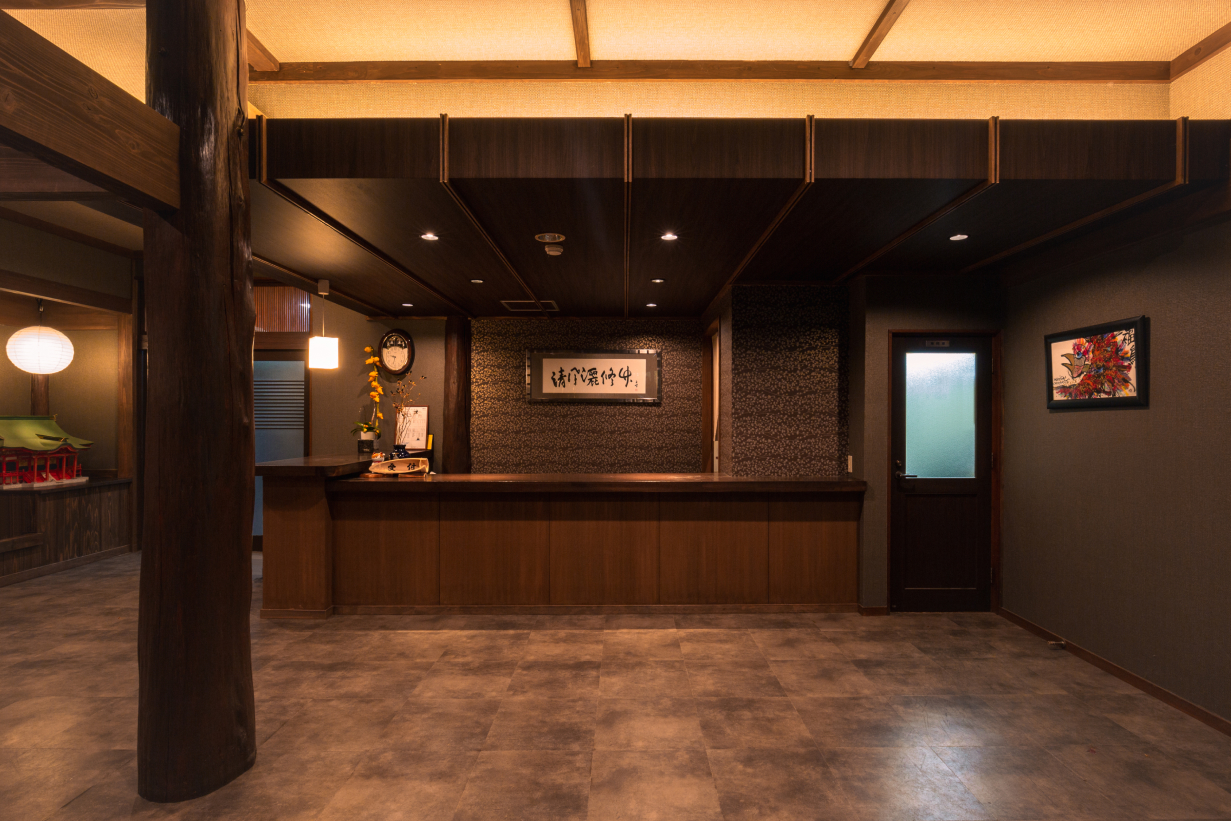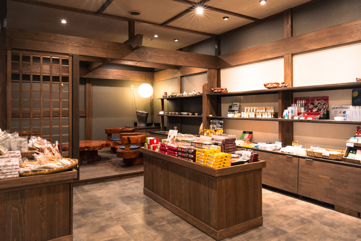 玄関は季節によって色づきが変わり、訪れる度に様々な表情でお客様をお出迎え。趣のある造りと竹あかりが優しく照らすロビーは、落ち着きのある雰囲気を演出。併設されたスーベニアスペースでは、地元南阿蘇のお菓子などのお土産をご購入いただけます。