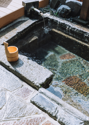 南阿蘇の大地によって、長い時間をかけて磨かれてきた温泉は、肌ざわりがやわらかく、刺激の少ないアルカリ単純泉です。湯温はややぬるめで、ゆっくりと時間をかけて湯を愉しむことができるのが特長です。美肌効果があるとされ、湯上がりの肌はすべすべで、多くのお客さまから高い評価をいただいています。疲労回復や関節痛、冷え性、痔疾などにも効果が期待されます。